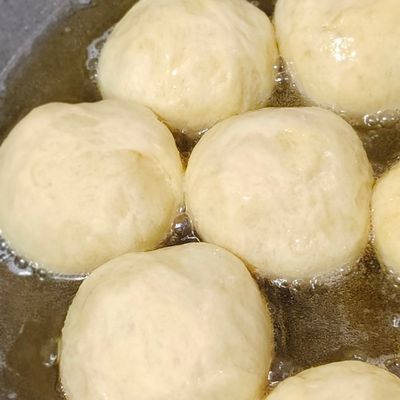 Panaskan minyak goreng dalam wajan dengan api sedang. Setelah panas, kecilkan api dan goreng donat hingga berwarna kuning keemasan.